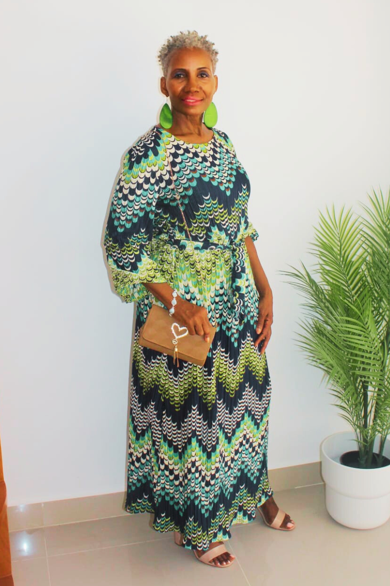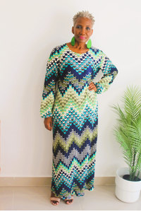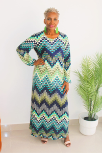 The Madona Chevron Midi Dress features a sophisticated multi-colored chevron pattern in cool blue and green tones that transitions beautifully throughout the piece. This versatile midi silhouette showcases long sleeves with elasticized cuffs that create an elegant puffed effect, while the scoop neckline offers a flattering, refined look.
