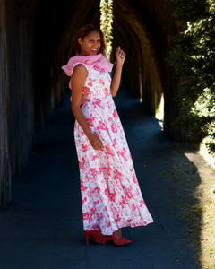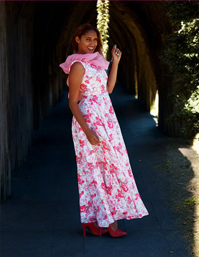 The Cecilia A-line floral gown in  crepe is perfect for  a spring or summer time event. Due to the exclusives of the printed fabric, only one gown was made.