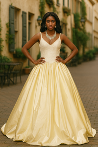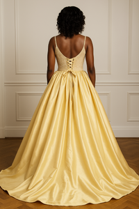 The Back is Featuring a lace-up corset back with delicate straps and a full satin skirt that cascades into a sweeping silhouette, this gown is both regal and romantic.