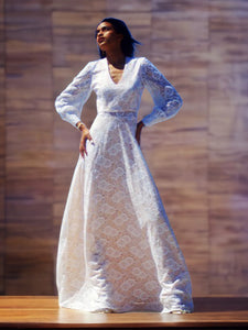 This breathtaking wedding gown blends timeless romance with effortless grace. Crafted in delicate white lace over a soft peach lining, its long sheer sleeves and flowing A-line silhouette capture the perfect balance of sophistication and ease. The V-neckline adds a touch of allure, while the airy design makes it ideal for a beachside ceremony or a dreamy outdoor celebration. A gown that moves as beautifully as the waves behind it—pure elegance, made unforgettable.