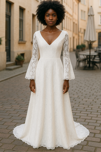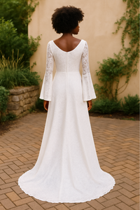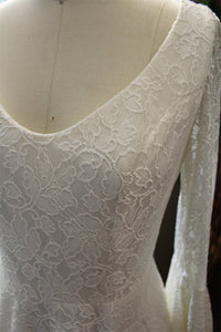 The Tabita bell sleeves wedding gown is a very classic and timeless gown that fits well.  The V-neck shape really accentuates  your assets.  This garment is a true size 6.