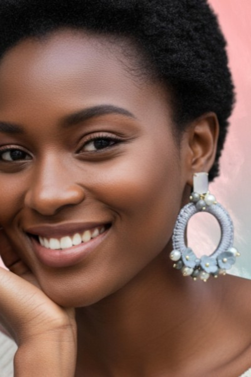 Handcrafted with meticulous attention to detail, the Alina Frosted Petal Earrings feature delicate crocheted floral motifs adorned with lustrous pearls and complementary beads in soft grey tones.