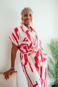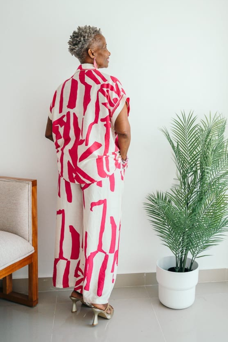 The Giana Hot Pink & Beige Pants Set features a short-sleeve shirt adorned with a modern geometric pattern, complete with a classic collar and front button closure for a refined look. Paired with comfortable palazzo pants that offer an elastic waistband and convenient side pockets, this set balances contemporary style with practical comfort, making it an ideal choice for versatile wear.