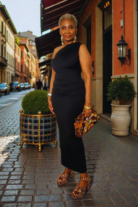 The Olinda One Shoulder Black Fitted Dress features an elegant asymmetrical neckline that highlights your silhouette with refined sophistication. Designed with side rushing to enhance and flatter your curves, this dress offers a sleek, body-hugging fit complemented by a tasteful side slit for ease of movement and subtle allure. Perfect for formal occasions or evening events, it combines modern style with comfortable wearability.
