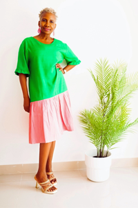 The Shania Color Blocking Dress combines contemporary design with luxurious 100% silk dupioni fabric in striking green and pink color blocking. This expertly crafted piece features a relaxed scoop neckline with delicate ruffled sleeves that gather at the elbow for refined movement.