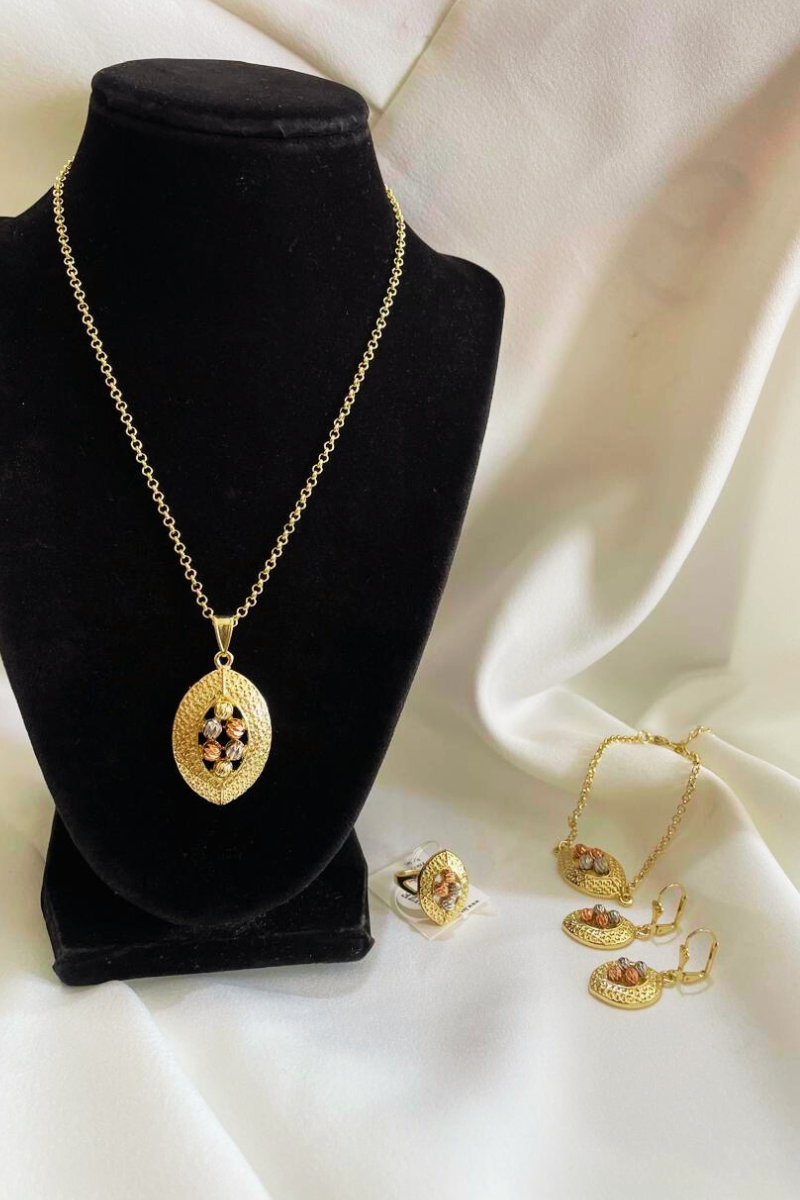 Elevate your everyday elegance with the Soledad Gold plated Jewelry Set, a curated collection designed for the discerning wearer. Each piece—from delicate pendant earrings to refined bracelets and rings—showcases luxurious gold finishes that complement any occasion. The thoughtfully coordinated set allows you to layer and mix pieces, creating versatile looks that transition seamlessly from day to evening. Crafted with attention to detail, these adornments embody understated sophistication and timeless appeal, making them an essential addition to your jewelry wardrobe.