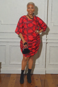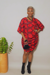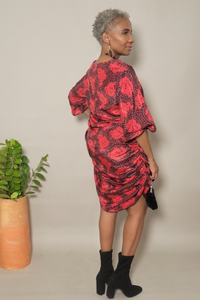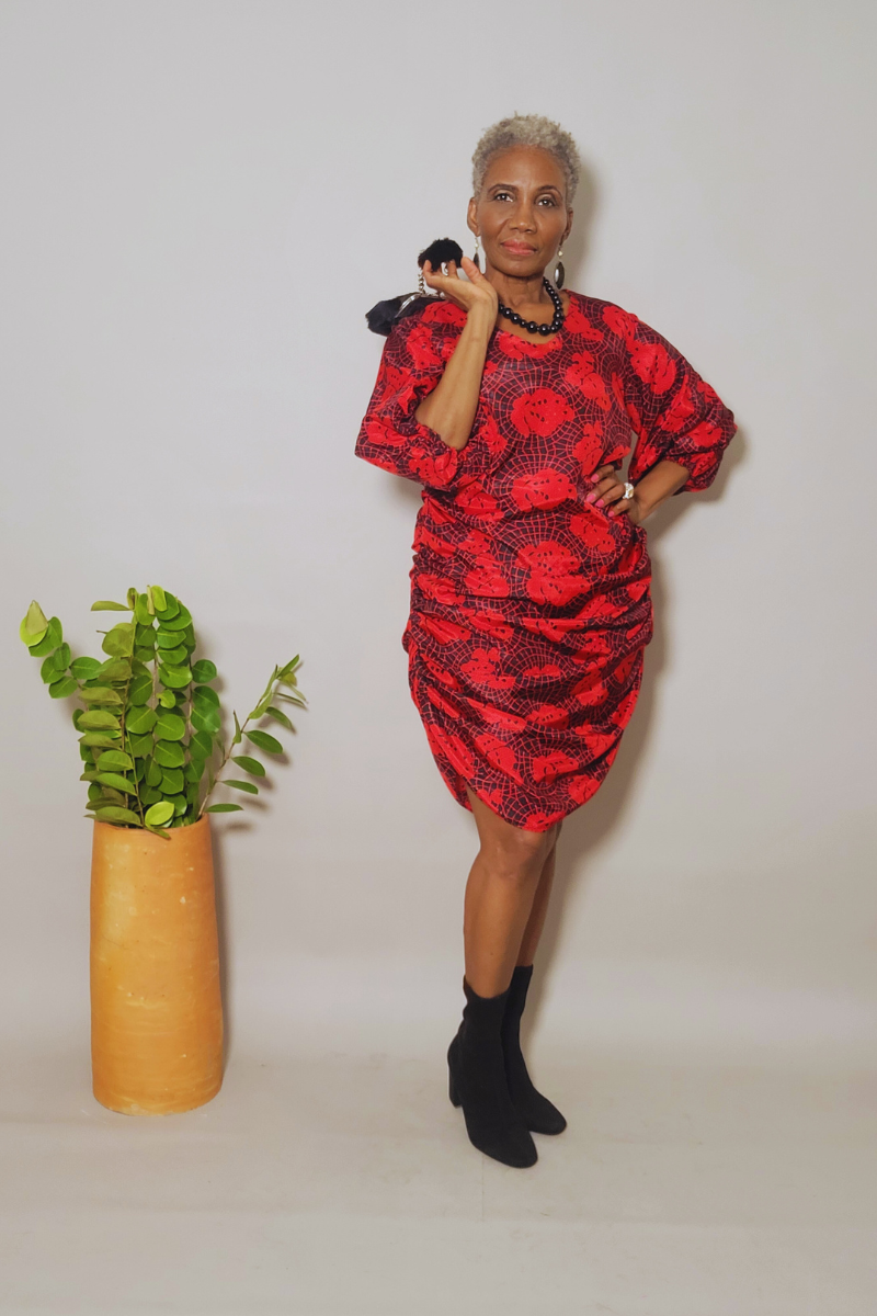 The Magdaline Printed Side Rushing Dress combines contemporary design with practical elegance. Crafted from a luxurious polyester silk blend, this knee-high dress features a striking red and black geometric print that makes a bold statement. The flattering V-neckline pairs beautifully with voluminous 3/4 puff sleeves for a modern silhouette with vintage-inspired charm.